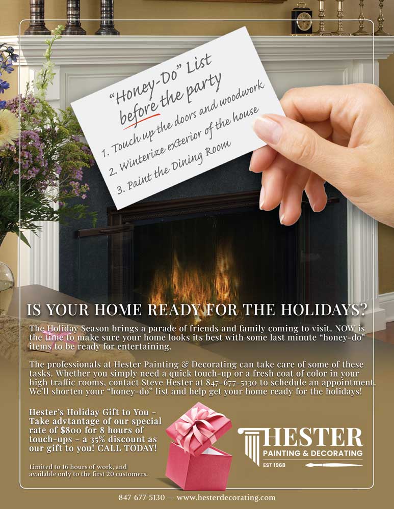 The professionals at Hester Painting & Decorating can take care of some of these tasks. Whether you simply need a quick touch-up or a fresh coat of color in your high traffic rooms, contact Steve Hester to schedule an appointment.