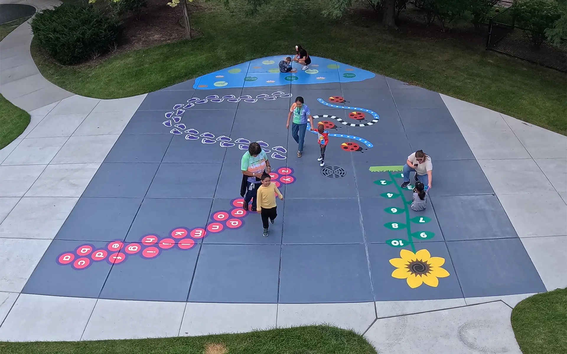 A project at a special ed school in Morton Grove (Julia Molloy Educ. Ctr.). Seeing kids enjoying playing on a sensory path mural that I painted on concrete pavement was a wonderful feeling.