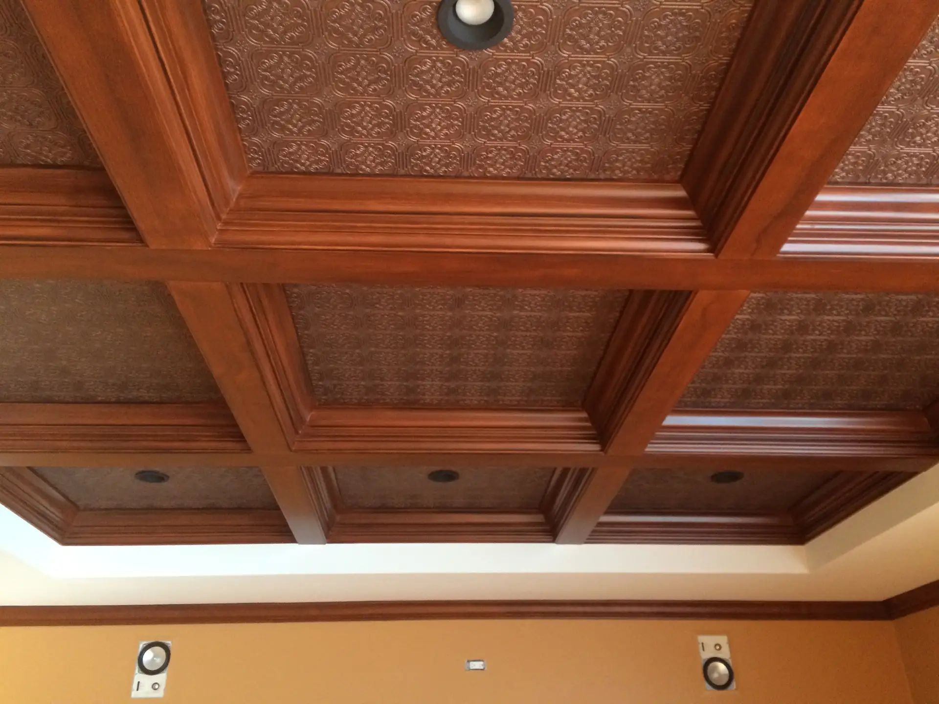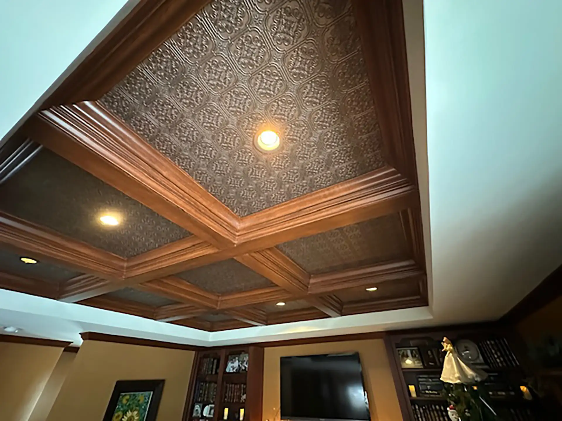 The ceiling in this living room was built out by a carpenter to give Hester’s craftsmen the palette to work with for this striking faux finished final appearance.