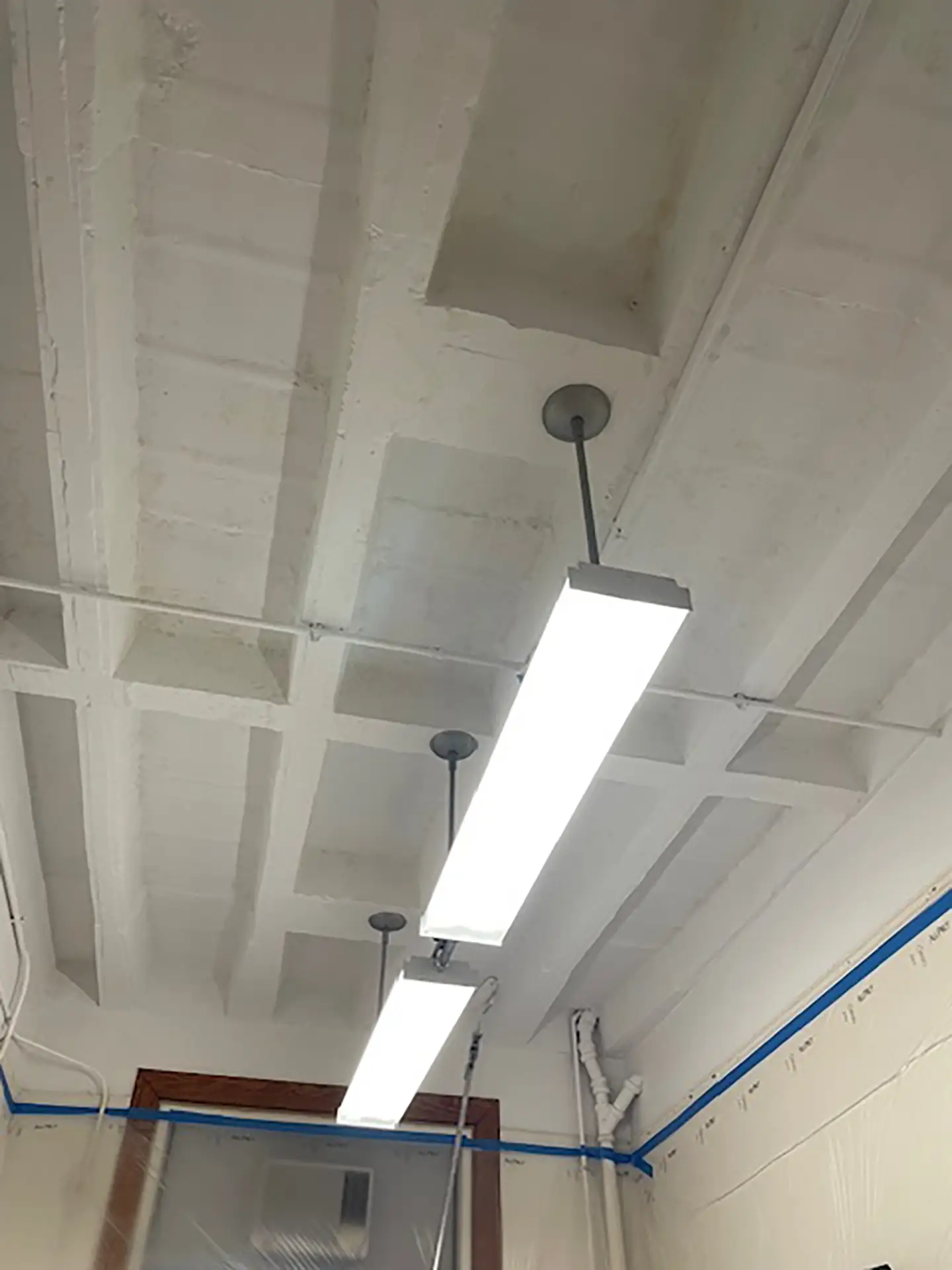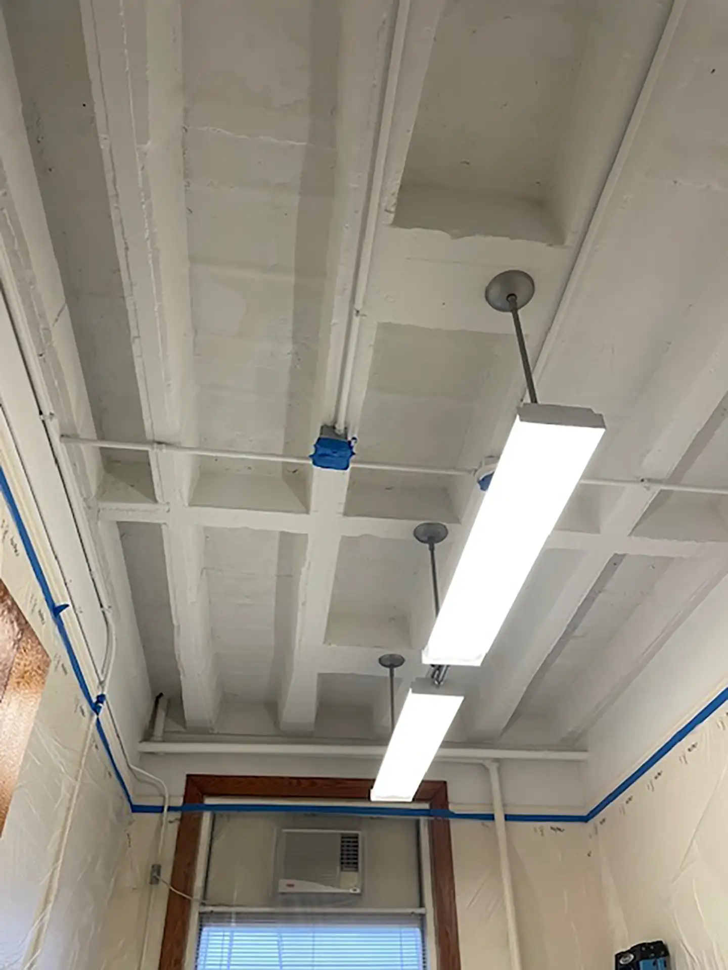 Hester Painting & Decorating’s commercial team removed failing paint through thorough scraping and surface preparation, followed by the application of a specialized paint-failure primer (PEEL STOP). The project was completed with two uniform finish coats, resulting in a clean, durable, and long-lasting ceiling surface.
