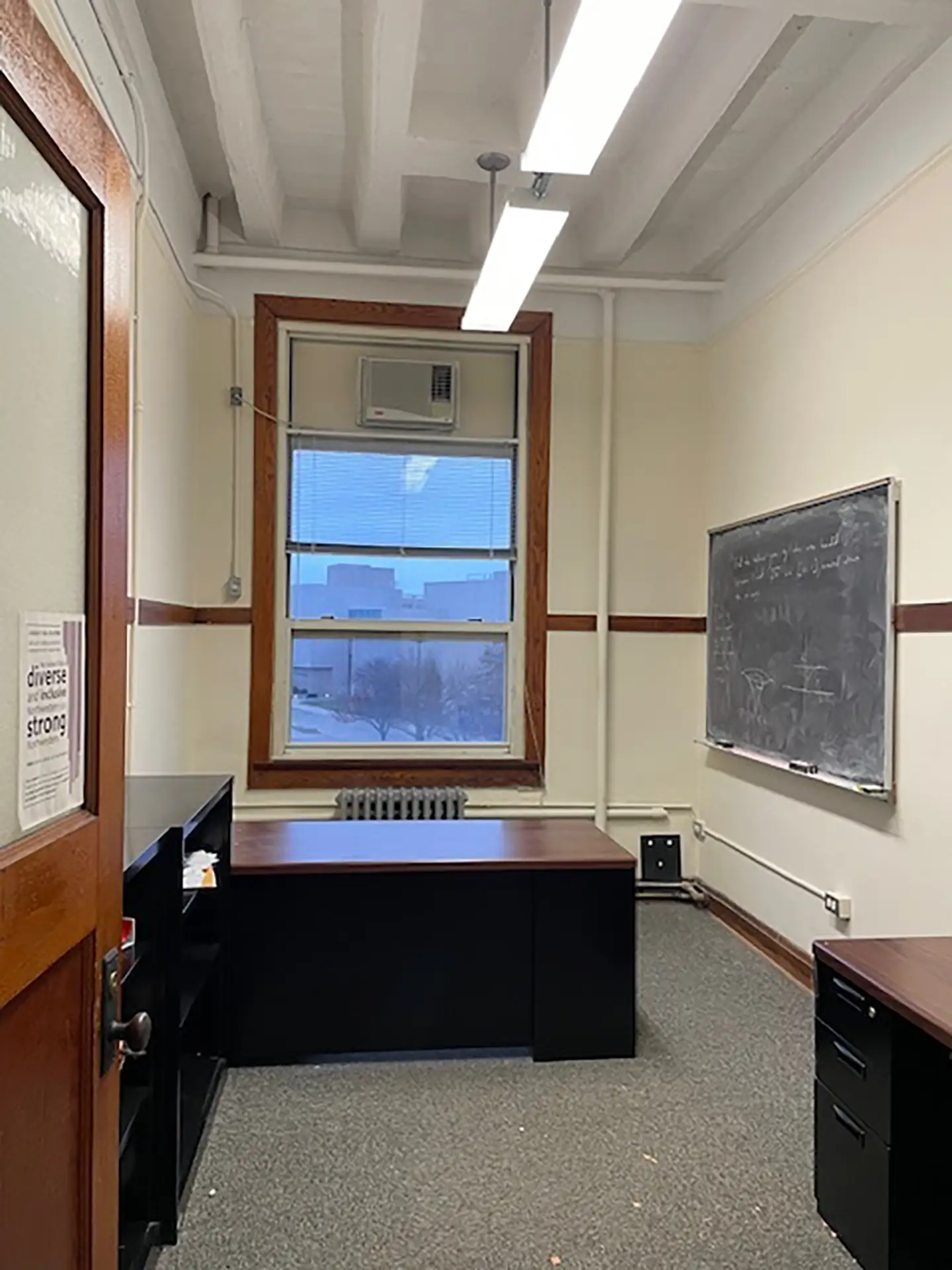 This project shows the restoration of a professor’s office featuring high bay concrete ceilings approximately 12 feet in height.